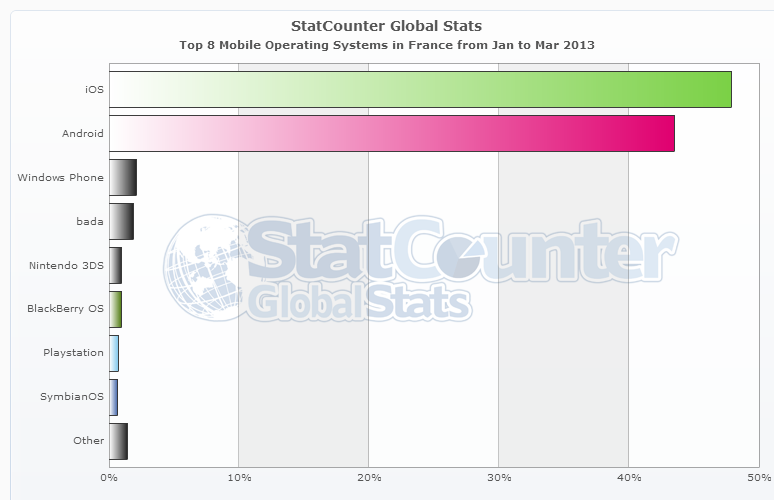 On se rappellera des chiffres de ventes de IDC et du biais méthodologique propre à StatCounter qui analyse les visites sur les sites Web… Tout cela est donc à pondérer et iOS n’est pas forcément l’OS le plus présent aujourd’hui en France, les différences gigantesques dans les ventes nous le prouvent. Cela confirme juste que les utilisateurs d’IPhone et d’IPad visitent le Web avec le browser Apple alors que sous Android les applications natives sont préférées des utilisateurs. Deux cultures différentes.