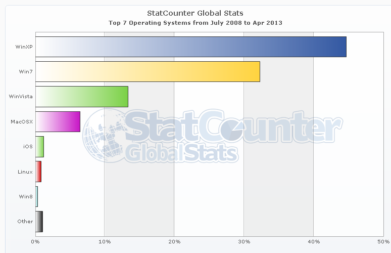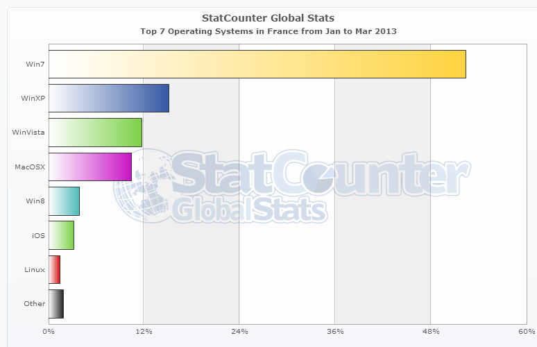 Ce graphique montre le Top 7 des OS dans le monde sur la période 2008 / 2013. Vous pouvez obtenir les chiffres exactes sous différentes formes (fichier csv, graphique…) en vous rendant sur le site de StatCounter.