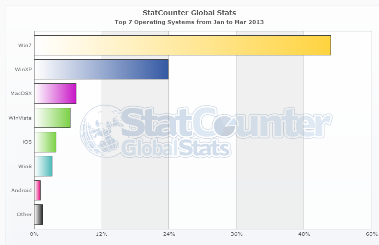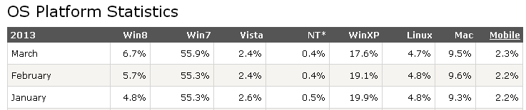 Mac OSX reste stable, Vista disparait petit à petit, et iOS fait un score supérieur à Windows 8. Android sur ces trois derniers mois semble en recul, c’est un biais de cette statistique particulière. D’autres statistiques vont nous éclairer sur ce point.