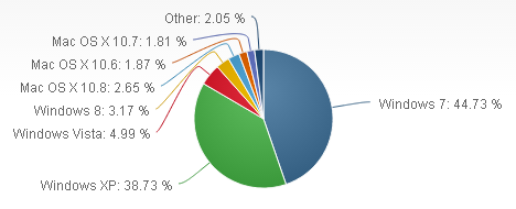 On voit clairement sur cette période la domination de Windows XP, suivi de très près par Windows 7 et même ce sacré Vista ! Tout au bout du classement, là où les parts de marché n’ont pas de prise sur les décisionnaires, on trouve en vrac Mac OSX, iOS, Linux, Windows 8 et d’autres.