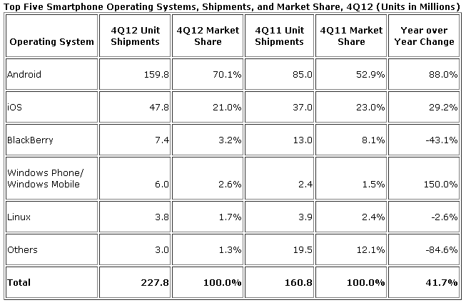 Cette vision est assez différente de l’analyse du Web. Elle montre que sur les 227,8 millions de machines vendues 159,8 millions sont des Android ! La part d’Android entre fin 2011 et fin 2012 est passée de 52.9% à 88% du marché. Apple avec iOS a baissé de 37% à 29.2%.