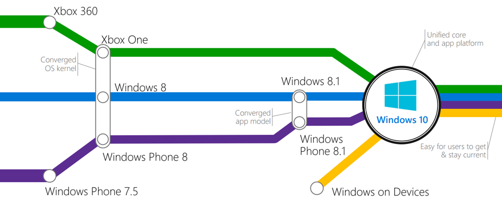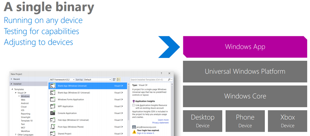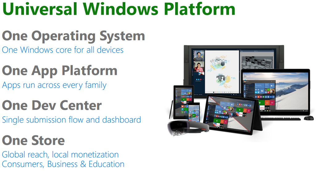 Mais c’est désormais le présent qui enfonce le clou de cette vision qui avait quelques années d’avance sur les faits : Windows 10 réalise pleinement ce concept d’universalité verticale, à tel point même que la plateforme de développement s’appelle UWP (Universal Windows Platform). Même le terme et le thème de l’universalité ont été repris… (je vais demander des copyrights si ça continue !).