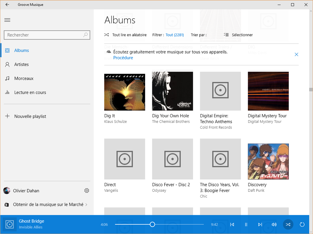 La barre bleu s’est allongée, elle affiche des informations sur le disque en cours. La liste des pochettes prend maintenant une place plus importante mais apparait à gauche un système de menu facilitant le pilotage du logiciel.