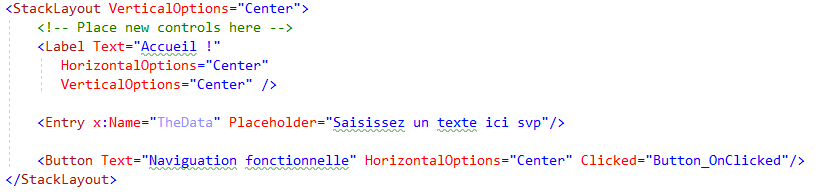 La syntaxe adoptée par Xamarin est classique désormais, on la retrouve dans des frameworks MVVM d’ailleurs, c’est la syntaxe “web”. Voici comment je vais passer le contenu du Entry s’appelant TheData :