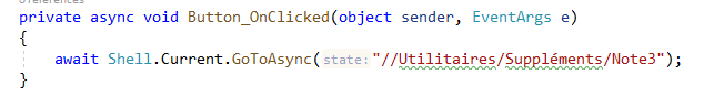 Le bouton qui se trouve en dessous avait déjà été placé dans un article précédent, nous allons conserver cette navigation là et recevrons donc “TheData” dans la page visée…qui se trouve être sur la route "//Utilitaires/Suppléments/Note3" sachant que Note3 dans notre schéma paresseux est un repiquage de la même Vue secondaire “SecondaryPage.xaml”. Dans la réalité il s’agira bien entendu d’une page ayant plus de sens, tout comme la donnée passée et son exploitation…