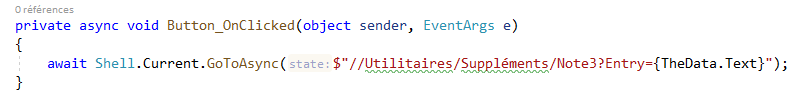 On notera que l’absence de MVVM oblige à faire des choses affreuses comme donner un x:Name au Entry. Pouah ! Mais c’est pour la bonne cause de la simplification de l’exemple…