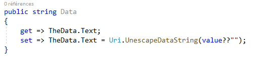 TheData est le nom du Label posé sur la fiche. L’astuce de l’Uri.UnescapeDataString est une habitude en mode web de supprimer les caractère d’échappement éventuellement passés en paramètre. Ici le texte étant tapé par l’utilisateur il n’est pas idiot de se protéger. S’il s’agit de paramètres passés de code à code, il est alors préférable de ne pas dénaturer ce qui est passé et de vérifier qu’on ne passe pas n’importe quoi et comment on se sert de la donnée récupérée.
