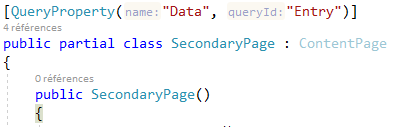 L’attribut est “QueryProperty”. Le premier paramètre est le nom de al propriété réceptrice de la donnée (“Data”) quant au second paramètre c’est le nom du paramètre dans l’URI. Rappelez vous on passe la donnée par un “….?Entry={xxxx}”. Entry est le nom du paramètre.